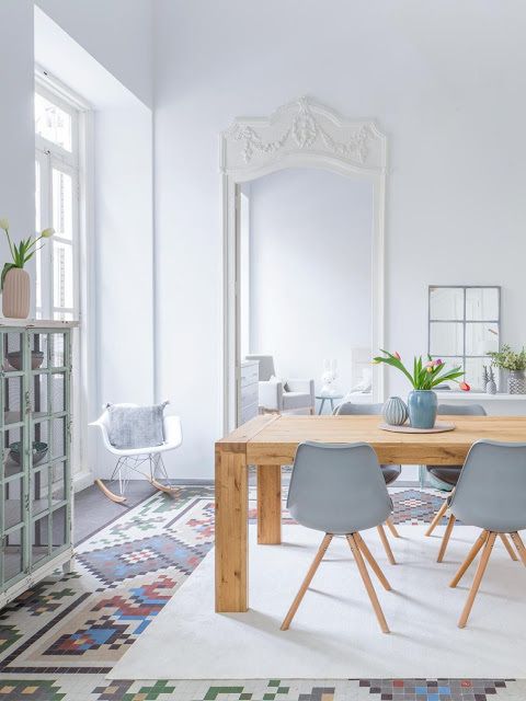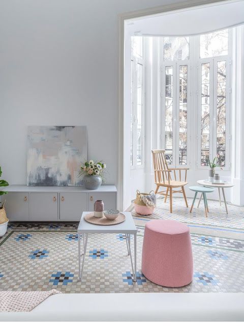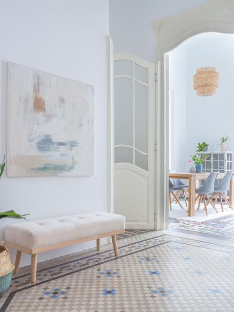 Tout est parti de cet appartement espagnol dans lequel le carrelage au sol est un travail d'orfèvre s'adaptant à la forme et à la taille de la pièce et formant parfois un véritable motif comme le ferait un tapis. Ce carrelage composé pour la trame de fond d'un damier blanc et gris-beige donne le ton au reste de la déco qui sur une base sobre et claire se ponctuent de détails colorés.