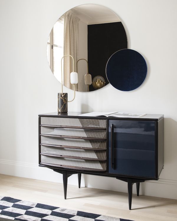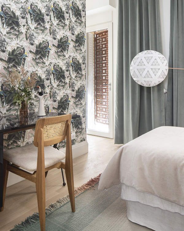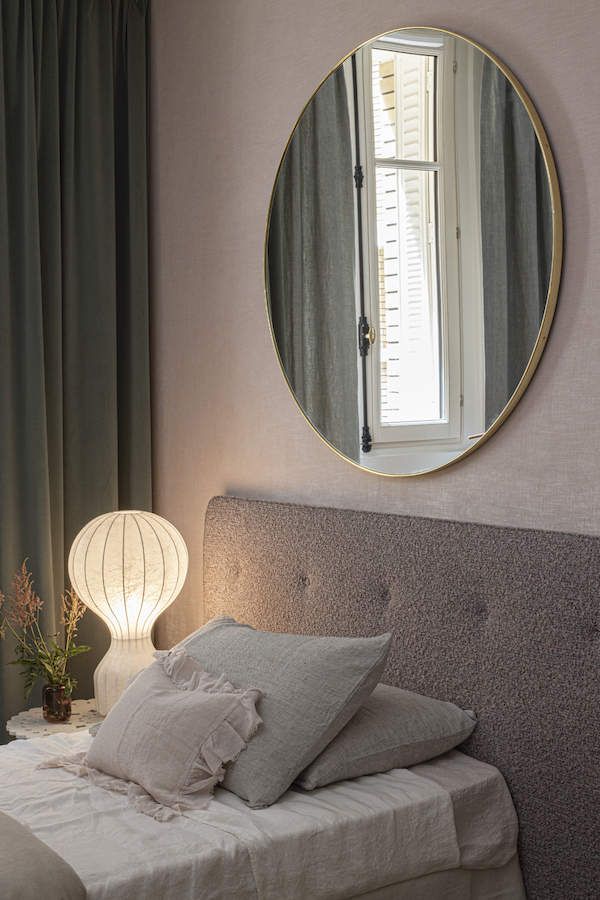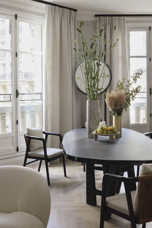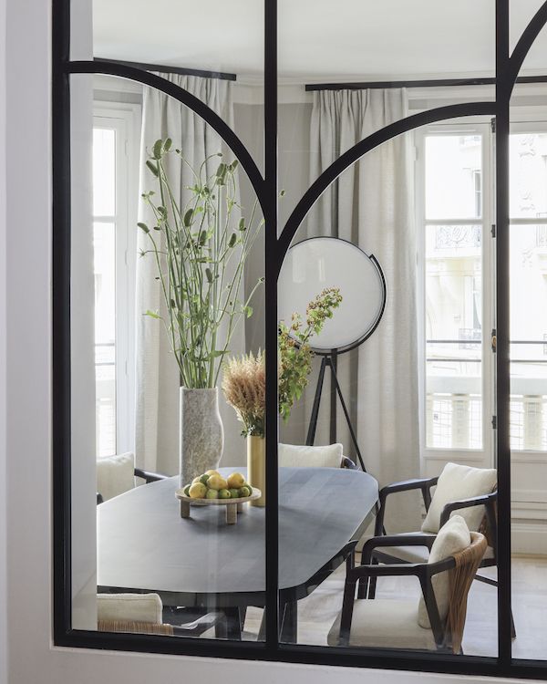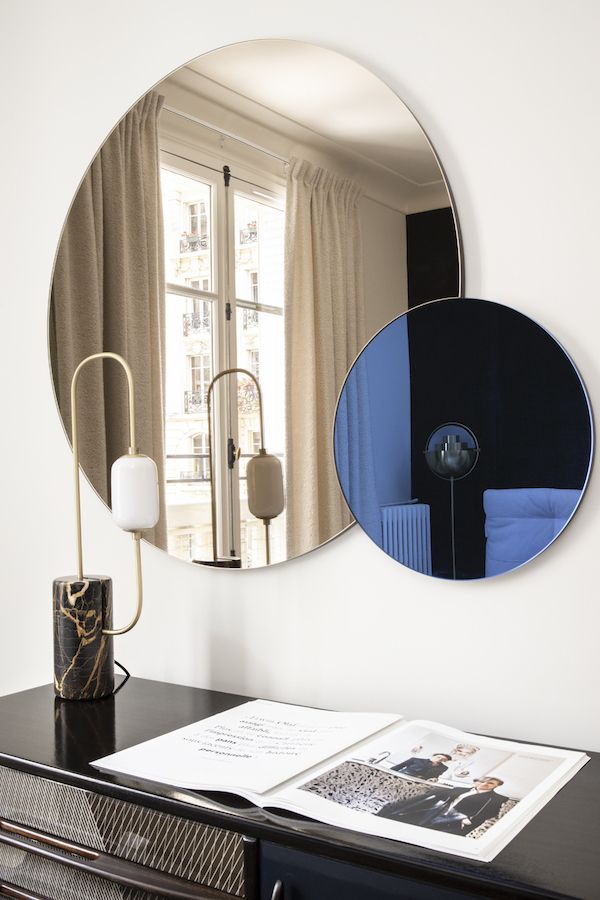 Le canapé Bardot de Baxter dans une couleur de cuir Kiwi et la banquette en velours de Flexform , des rideaux d’India Mahdavi pour Pierre Frey, la console Eros d’Agape Casa d’Angelo Mangiarotti, le miroir de Kiko Lopez et la B-Light dessinée par Dan Yeffet pour Collection Particulière, la table de repas YBU de Christophe Delcourt, la pièce de vie constitue un véritable catalogue de pièces de design confidentielles.